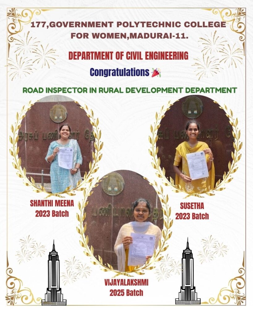 அந்த வகையில் தமிழ்நாடு அரசு பணியாளர் தேர்வாணையம் மூலம் ஊரக வளர்ச்சி மற்றும் ஊராட்சித்துறையில் சாலை ஆய்வாளர்க்கான 957 காலி பணியிடங்களுக்கு தேர்வுகள் நடைபெற்றது. அதன் ஒரு பகுதியாக மதுரை சுப்ரமணியபுரம் பகுதியில் அரசு மகளிர் பாலிடெக்னிக் கல்லூரியில் பொறியியல் பயின்ற மூன்று மாணவிகள் டிஎன்பிஎஸ்சி தேர்வு மூலம் சாலை ஆய்வாளர் பணிக்கு தேர்வாகி டிஎன்பிஎஸ்சி மூலம் பணி நியமன ஆணைகளை பெற்றுள்ளனர். அந்த மூன்று மாணவிகளை கல்லூரி முதல்வர் விஜயகுமாரி, ஆசிரியர்கள், பெற்றோர்கள் சக மாணவிகள் பாராட்டினர்.