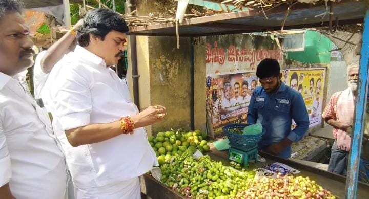 சிவகாசியில் தேர்தல் பிரச்சாரத்தை துவங்கிய முன்னாள் அமைச்சர் ராஜேந்திர பாலாஜி காய்கறி வியாபாரம் செய்து நூதன முறையில் பிரச்சாரம் மேற்கொண்டார்..