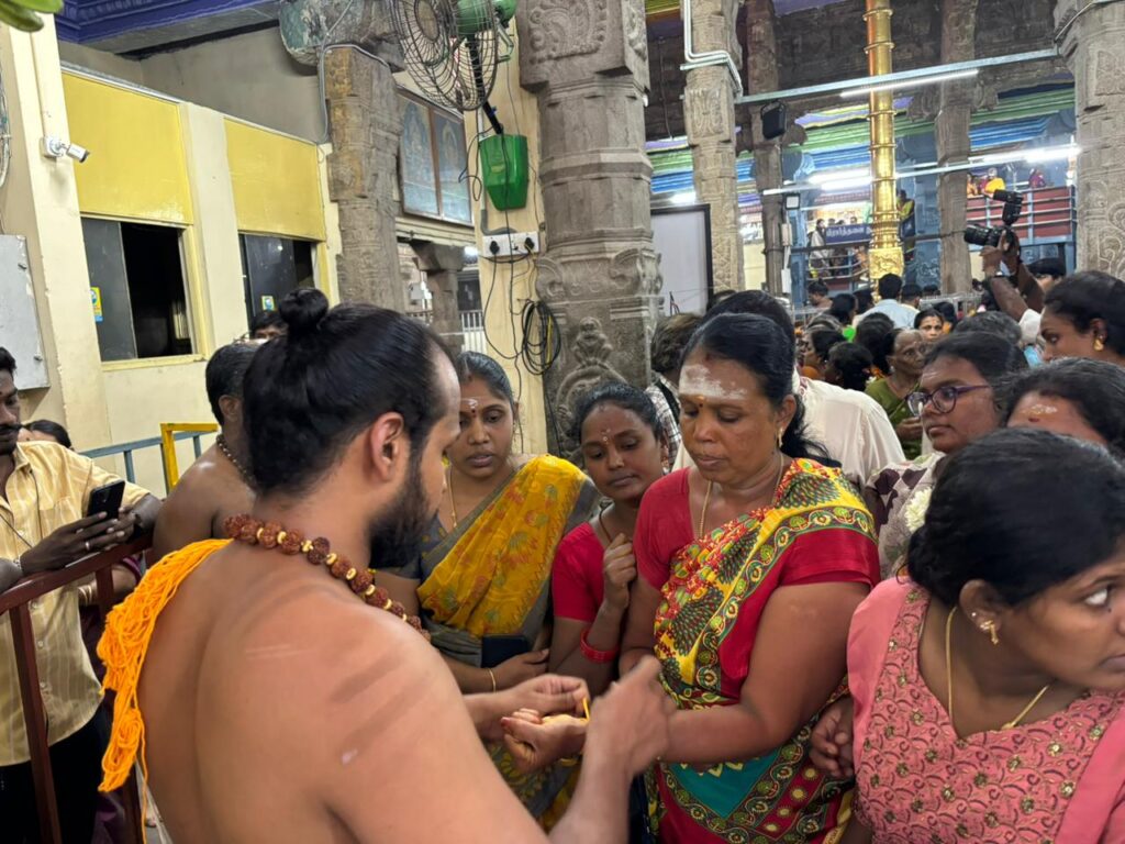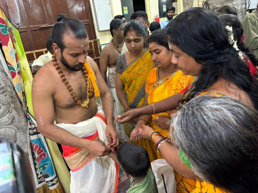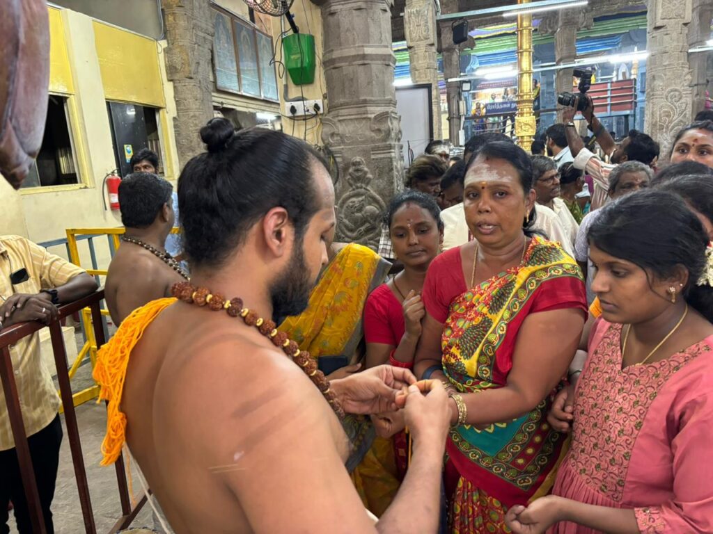 திருவிழா நம்பியார் சிவாச்சாரியாருக்கு காப்பு கட்டப்பட்டபின்பு விரதம் மேற்கொள்ளும் பக்தர்களுக்கு சிவாச்சாரியார்கள் காப்பு கட்டினர்.
