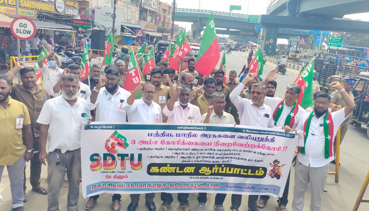 கோவை உக்கடம் பேருந்து நிலையம் அருகே ஷோசியல் டெமாக்ரடிக் டிரேடு யூனியன்(SDTU) சார்பாக மூன்று அம்ச கோரிக்கையை வலியுறுத்தி மத்திய மாநில அரடை கண்டித்து 100-க்கும் மேற்பட்ட ஆட்டோ ஓட்டுனர்கள் கண்டன ஆர்பாட்டத்தில் ஈடுபட்டனர். ஆர்பாட்டத்தில் மத்திய மாநில அரசுக்கு எதிராக கண்டன கோஷங்களை எழுப்பினார்.