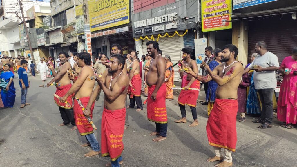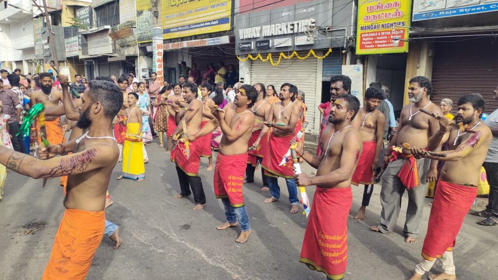 கோவில் வந்து அடையும் இந்த ஊர்வலத்தில் கலந்து கொண்ட பக்தர்கள் வேசுக்கோ, தீசுக்கோ என்று பாடிக் கொண்டும் ஆடிக்கொண்டும் கத்தியால் கைகளில் வெட்டிக் கொண்டே அம்மனை அழைத்தனர். இதனால் அந்த பக்தர்களின் உடலில் ரத்தம் வழிந்து ஓடியது அந்த வெட்டுக் காயங்களின் மீது திருமஞ்சனப் பொடியை வைத்துக் கொண்டு, ஆடிக்கொண்டே சென்றனர்.