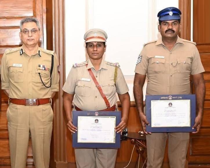 மதுரை மாவட்டம் கோ.புதூர் காவல்நிலைய எல்லைக்குட்பட்ட பகுதியில், பெண்ணிடமிருந்து 6 பவுன் தங்கச் சங்கிலியை வழிப்பறி செய்த வழக்கில் குற்றவாளியை துணிச்சலாக துரத்தி பிடித்த கோ.புதூர் குற்றப்பிரிவு பெண் காவல் ஆய்வாளர் நிர்மலா மற்றும் தலைமை காவலர் செந்தில்பாண்டியன் ஆகிய இருவரையும் தமிழ்நாடு காவல்துறை தலைமை இயக்குநர் சங்கர் ஜிவால் நேரில் அழைத்து பாராட்டுச் சான்றிதழ் மற்றும் வெகுமதி வழங்கினார்.