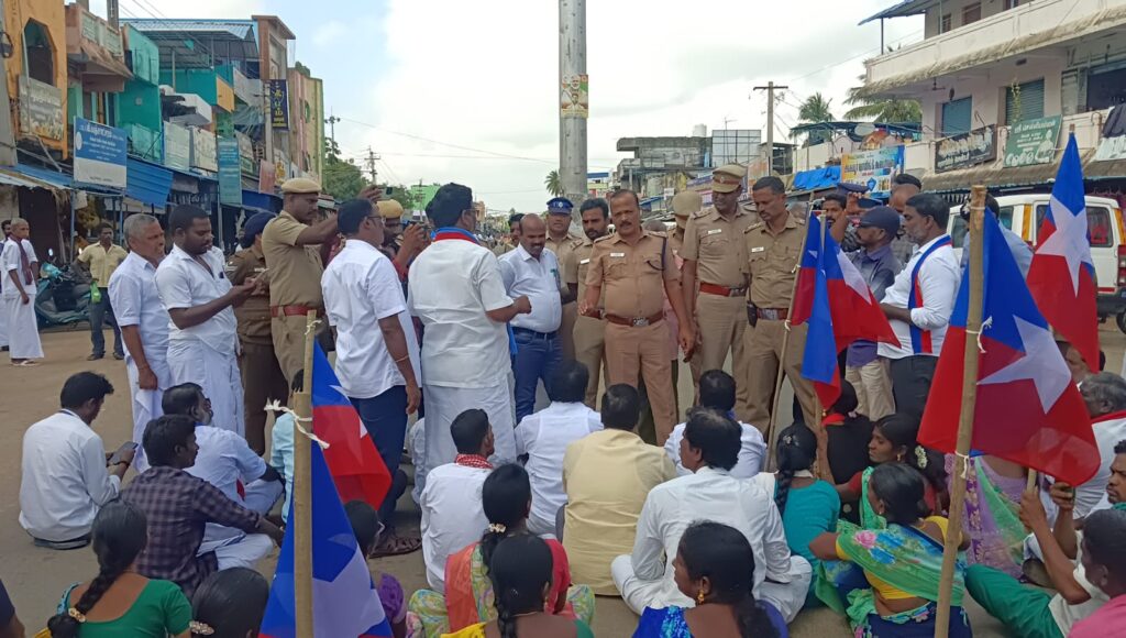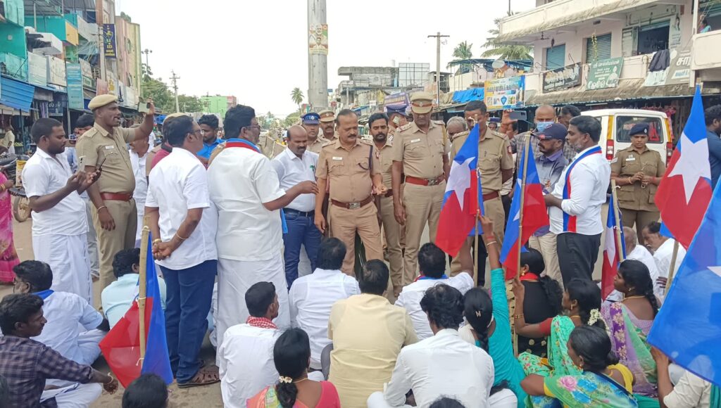 தஞ்சாவூர் மாவட்டம் ஒரத்தநாடு அருகே தஞ்சாவூர் மாவட்டம் ஒரத்தநாடு அருகே உள்ள ஊரணிபுரம் தளிகை விடுதி கிராமத்தில் அமைந்திருக்கும் அறநிலையத்துறைக்கு சொந்தமான திருப்பனங்காருடையார் கோயில் கும்பாபிஷேக விழாவில் சம உரிமை வழங்க வலியுறுத்தி சாலை மறியல் விடுதலைச் சிறுத்தைகள் கட்சி சார்பில் நடைபெற்றது