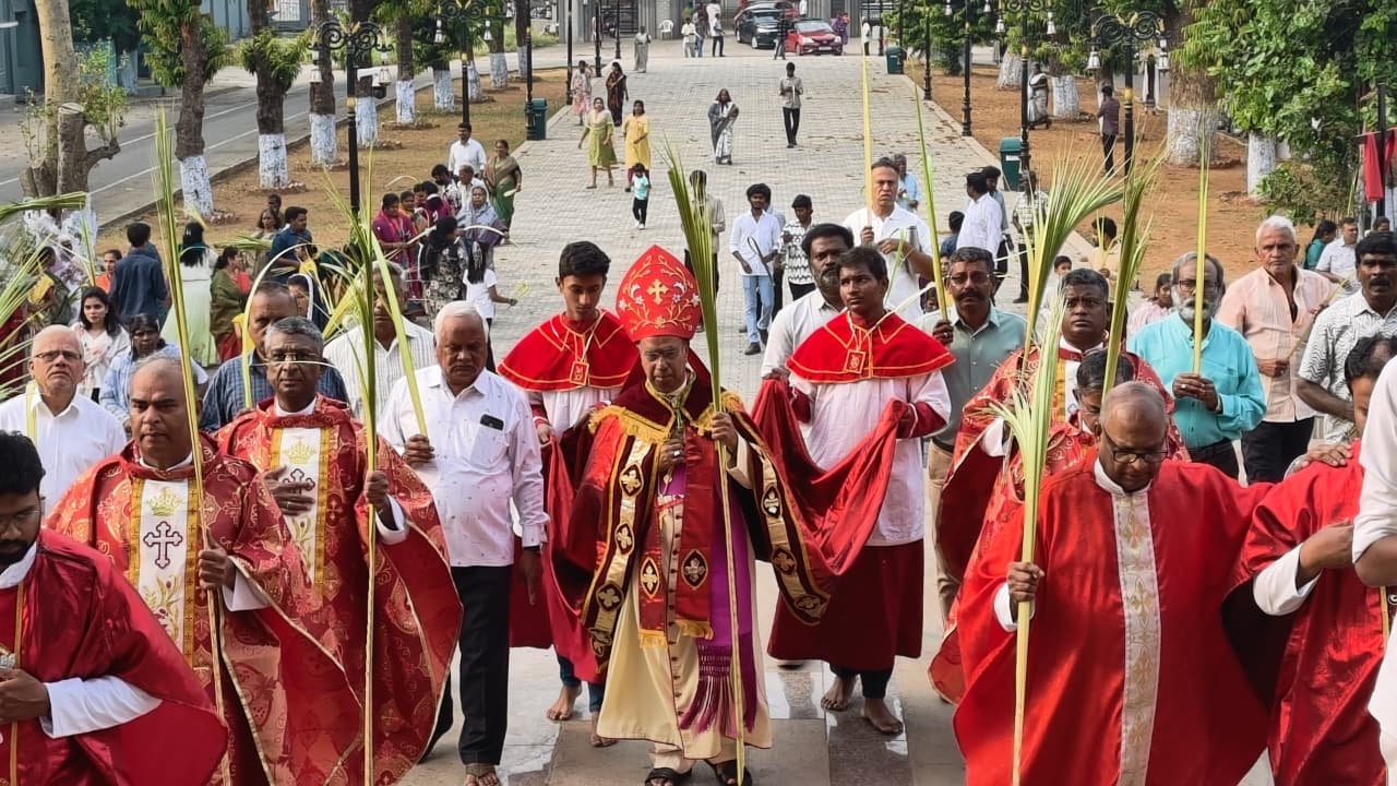 பேராலய வளாகத்தில் இருந்து புறப்பட்ட இந்த மாபெரும் பேரணி, முக்கிய வீதிகளின் வழியாக வலம் வந்த போது, மக்கள் தங்கள் கைகளில் இருந்த குறுத்தோலைகளை அசைத்து இயேசுவின் எருசலேம் வருகையை நினைவு கூர்ந்தனர்.