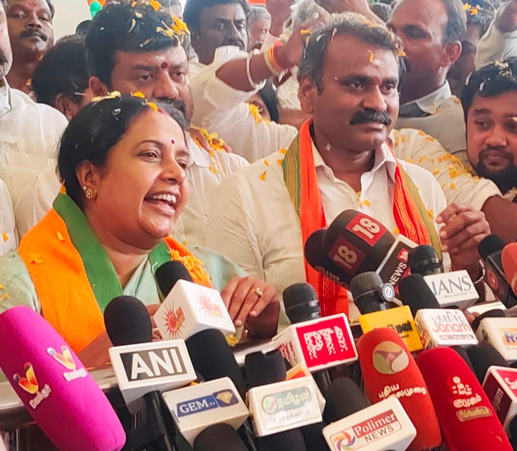 வானதி சீனிவாசன் மற்றும் எல்.முருகனுக்கு பாஜகவினர் மாலை அணிவித்தும், மலர் கிரீடம் அணிவித்தும், மலர் தூவியும் வரவேற்பளித்தனர்.