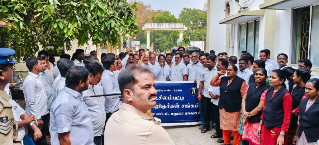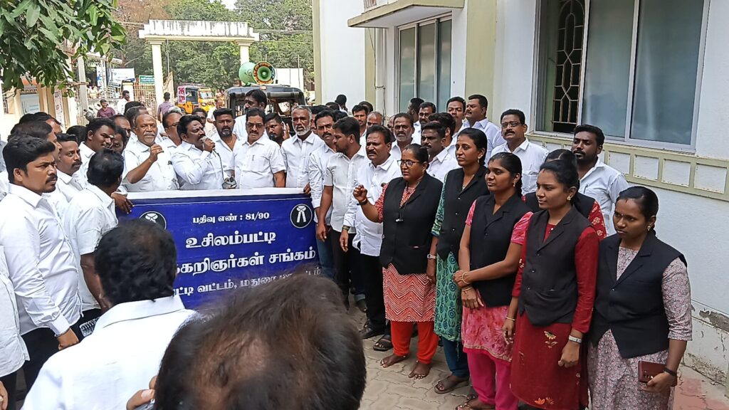இதில் உசிலம்பட்டி வருவாய் கோட்டாச்சியர் சண்முக வடிவேல் பிறப்பு இறப்பு சான்றிதழுக்கு இடைத்தரவர்களை வைத்து பணம் வாங்குவதாகவும், வட்டாட்சியர் பாலகிருஷ்ணன் பட்டா மாறுதல் மற்றும் பல்வேறு மனுக்களுக்கு கிடைத்தவர்கள் மூலம் லஞ்சம் வாங்குவதாகும் நில அளவையர் பிச்சைமணி இடம், நிலம் உள்ளிட்ட நில அளவைகளுக்கு லஞ்சம் பெற்றுக் கொண்டு பணிகளை செய்து வருவதாகவும் குற்றம் சாட்டி இவர்கள் மீது தமிழக அரசு துறை ரீதியான நடவடிக்கைகள் மற்றும் பணி மாற்றம் செய்ய வேண்டும் என கோஷங்களை எழுப்பி கண்டன ஆர்ப்பாட்டத்தில் ஈடுபட்டனர்.