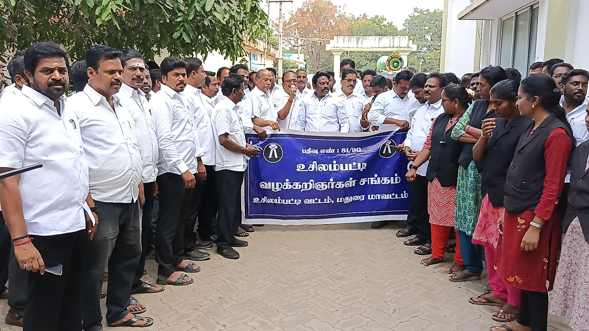 இந்நிலையில் இன்று இரண்டாவது நாளாக உசிலம்பட்டி வழக்கறிஞர்கள் சங்கத்தின் சார்பில் வழக்கறிஞர்கள் உசிலம்பட்டி வட்டாட்சியர் அலுவலகத்தை முற்றுகையிட்டு போராட்டத்தில் ஈடுபட்டனர்.