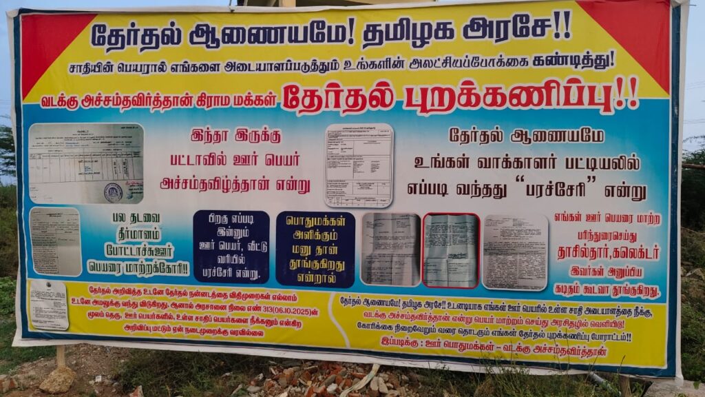 இந்த கிராமத்திற்கு 40 ஆண்டுகளுக்கு முன்பு பரசேரி என்ற ஜாதி பெயரை குறிப்பிட்டு பயன்படுத்தி வந்துள்ளனர். ஆனால் ஜாதி பெயரில் உள்ள ஊரை மாற்றி வடக்கு அச்சம் தவிர்த்தான் என்ற பெயரில் அரசாணை வெளியிட வேண்டும் என பல முறை கிராம சபை கூட்டங்களில் தீர்மானம் போட்டு மாவட்ட ஆட்சியருக்கும் மனு அனுப்பப்பட்டுள்ளது. அதேபோல் தமிழக அரசும் ஜாதி பெயரில் தெரு ஊர் இருக்கக் கூடாது என்று அரசாணை வெளியிட்டுள்ளது. அதன் அடிப்படையிலும் கிராம கூட்டத்தில் கடந்த ஒரு ஆண்டுகளுக்கு முன்பு தீர்மானம் நிறைவேற்றப்பட்டு ஆனால் இதுவரை அரசாங்க வெளியிடப்படாமல் உள்ளதால் இதை கண்டித்து வடக்கு அச்சம் தவித்தான் கிராமத்தைச் சேர்ந்த 130 வாக்காளர்கள் தேர்தலை புறக்கணிக்க போவதாக பிளக்ஸ் போர்ட் வைத்துள்ளனர்.