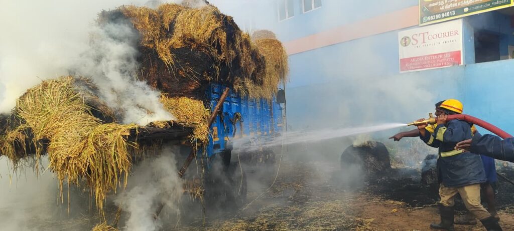மின் கம்பியில் வைக்கோல் உரசியதால் லாரி தீ பிடித்த சம்பவம்..,