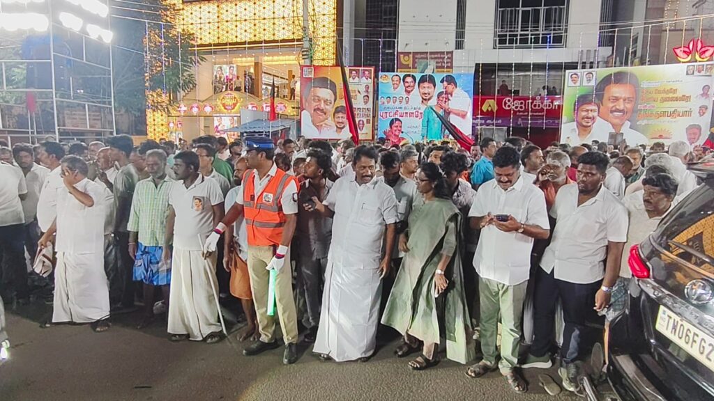 தென்காசியில் நடந்த அரசு நலத்திட்ட உதவிகள் வழங்கும் விழாவில் கலந்து கொண்ட தமிழக முதல்வர் மு.க ஸ்டாலின் சாலை மார்க்கமாக இராஜபாளையம் வழியாக மதுரை சென்றார். புதன்கிழமை இரவு இராஜபாளையத்தில் சாலையின் இரு புறங்களிலும் திரண்டிருந்த திமுக நிர்வாகிகள் மற்றும் மற்றும் கூட்டணி கட்சி நிர்வாகிகள் பொதுமக்கள் முதல்வர் மு.க ஸ்டாலினுக்கு உற்சாக வரவேற்பு அளித்தனர்.