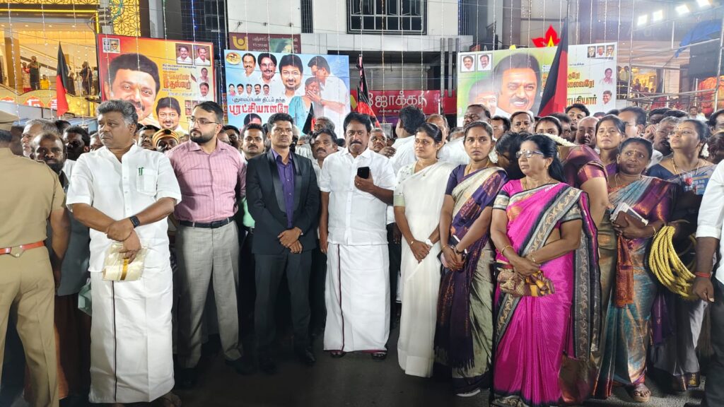 மு. க. ஸ்டாலினுக்கு திமுகவினர் மற்றும் கூட்டணி கட்சியினர் புதன்கிழமை இரவு வரவேற்பு அளித்தனர்.