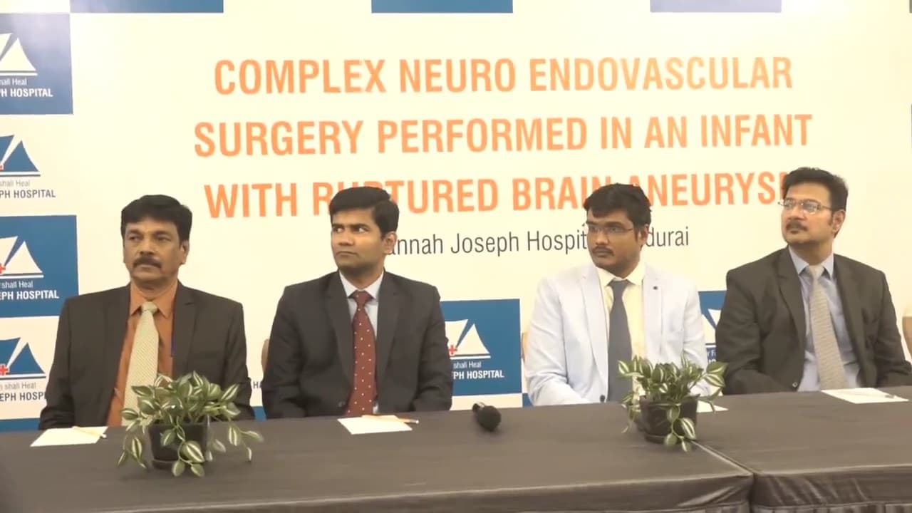 மதுரை ரிங் ரோட்டில் உள்ள ஹானா ஜோசப் மருத்துவமனையில் 9 மாத கைக்குழந்தைக்கு மூளை அனியுரிசம் கட்டி வெடித்து சுய நினைவிழந்த நிலையில் இருந்த கைக்குழந்தைக்கு மிகச் சிக்கலான நியூரோ எண்டோ வாஸ்குலர் அறுவை சிகிச்சை செய்து மருத்துவர்கள் சாதனை.