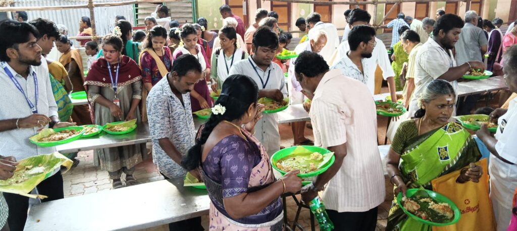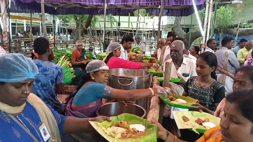 இரவு மாப்பிள்ளை விருந்தில் கேசரி வெண் பொங்கல் சாம்பார் வடை என 50 ஆயிரம் பேருக்கு வழங்கப்பட்டது.
