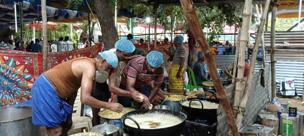 அரிசி 10டன், பருப்பு 3 டன், சமையல் எண்ணெய் 4 டன் பலசரக்கு 4.டன் வெல்லம் 2 டன் என மலை போல் குவிந்த பொருட்களை 1 ஆயிரத்து 500 தன்னார்வலர்கள் ,3000 பெண்கள் கலந்து ந்து கொண்டு காய்கறிகளை நேற்று பகலில் இருந்து இன்று காலை வரை வெட்டி சமையலுக்கு ஏற்பாடுதனர்.