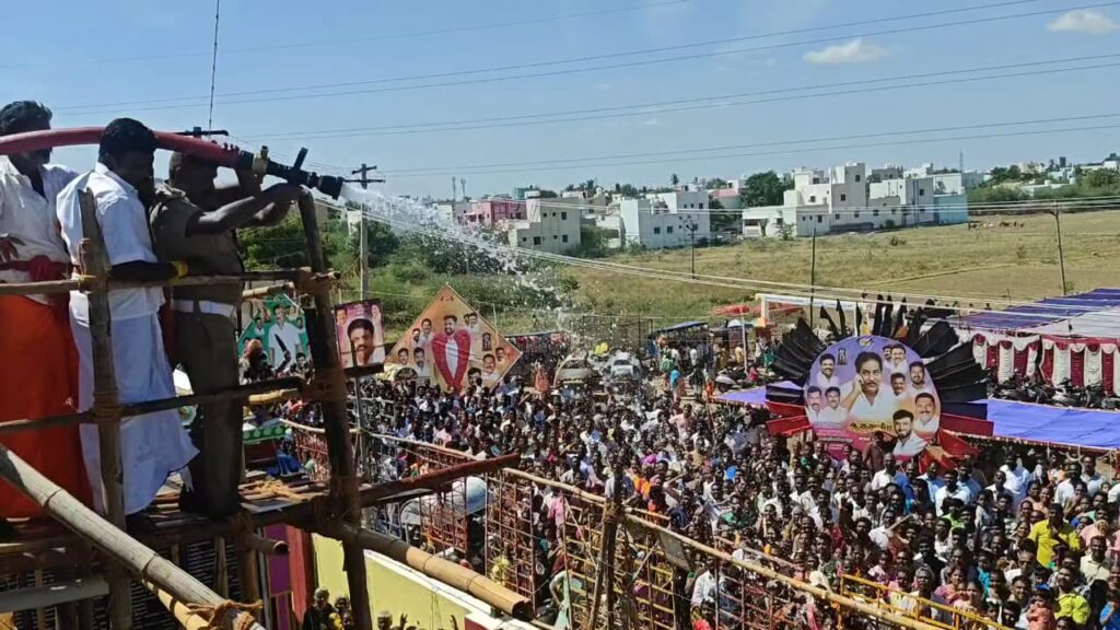 கோவில் கலசத்தில் புனித நீர் ஊற்றப்பட்ட பின்பு அதே புனித நீரை கோவிலுக்கு வருகை தந்த பக்தர்கள் மீது தெளிப்பது வழக்கம் ஆனால் இங்கு புனித நீர் என்ற பெயரில் தீயணைப்பு துறையினர் கொண்டு வந்திருந்த வாகனத்தில் இருக்கும் நீரை தீயணைப்பு குழாய் மூலம் கோபுர கலசத்தில் இருந்து பொதுமக்கள் மீது தெளித்தது பேசும் பொருளாகி வருகிறது.