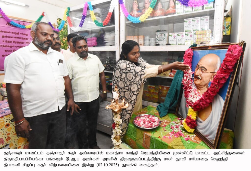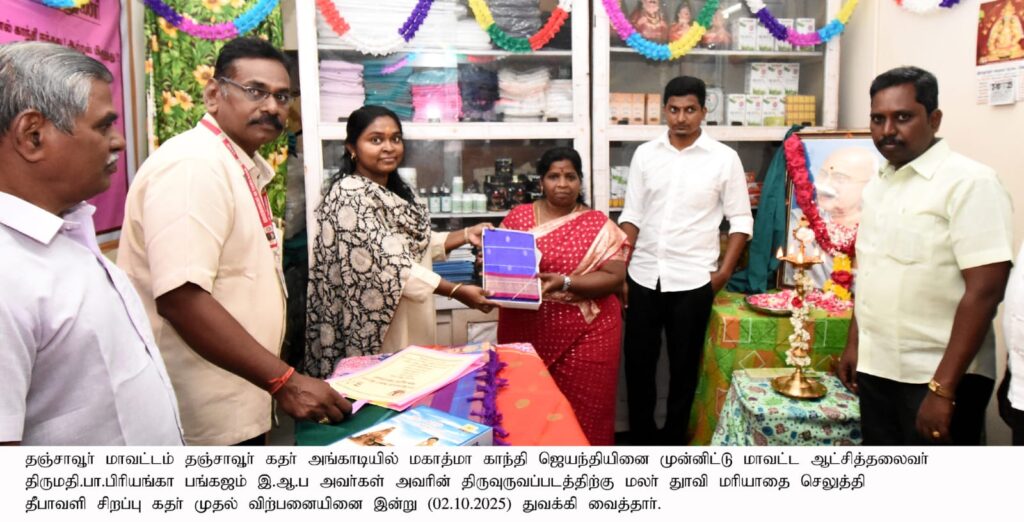 தஞ்சாவூர் கதர் அங்காடியில் அண்ணல் காந்தியடிகள் அவர்களின் பிறந்த நாள் விழா மற்றும் தீபாவளி சிறப்பு கதர் விற்பனையை மாவட்ட கலெக்டர் பிரியங்கா பங்கஜம் நேற்று தொடங்கி வைத்தார்.