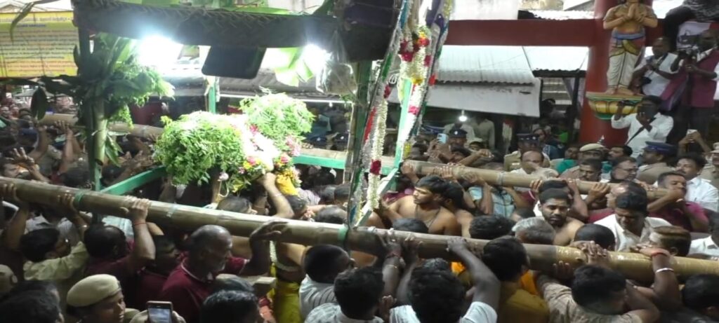 கரூர் மாரியம்மன் கோவில் வைகாசி திருவிழாவில் கம்பம் ஆற்றுக்கு அனுப்பும் நிகழ்ச்சி – லட்சக்கணக்கான பக்தர்கள் பங்கேற்றனர்.