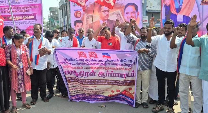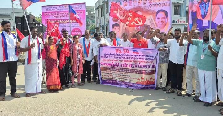 இந்திய கம்யூனிஸ்ட் கட்சியின் செயலாளர் பக்கிரிசாமி, விடுதலை சிறுத்தைகள் கட்சியின் மாநில அரசியல் குழு துணை செயலாளர் பொன்.செந்தமிழ்ச் செல்வன் ஆகியோர் முன்னிலையில் நடைபெற்ற ஆர்ப்பாட்டத்தில் நூற்றுக்கும் மேற்பட்டோர் மத்திய அரசு கொண்டுவந்துள்ள புதிய தொழிலாளர் சட்டங்களுக்கு எதிர்ப்பு தெரிவித்து கண்டன முழக்கங்களை எழுப்பி ஆர்ப்பாட்டத்தில் ஈடுபட்டனர்.