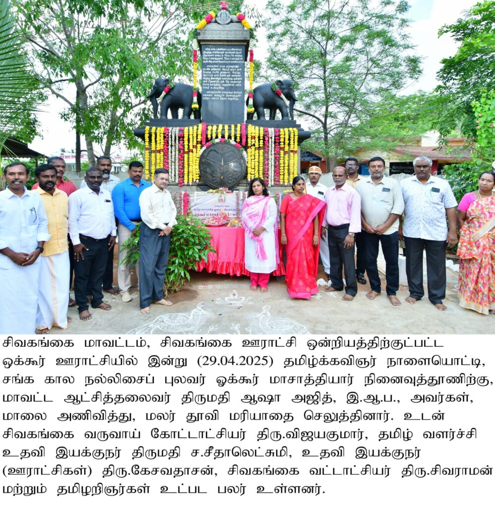 சிவகங்கை மாவட்டம், சிவகங்கை ஊராட்சி ஒன்றியத்திற்குட்பட்ட ஒக்கூர் ஊராட்சியில் , தமிழ்க்கவிஞர் நாளையொட்டி, சங்க கால நல்லிசைப் புலவர் ஓக்கூர் மாசாத்தியார் நினைவுத்தூணிற்கு, மாவட்ட ஆட்சித்தலைவர் ஆஷா அஜித், மாலை அணிவித்து, மலர் தூவி மரியாதை செலுத்தி தெரிவிக்கையில்,