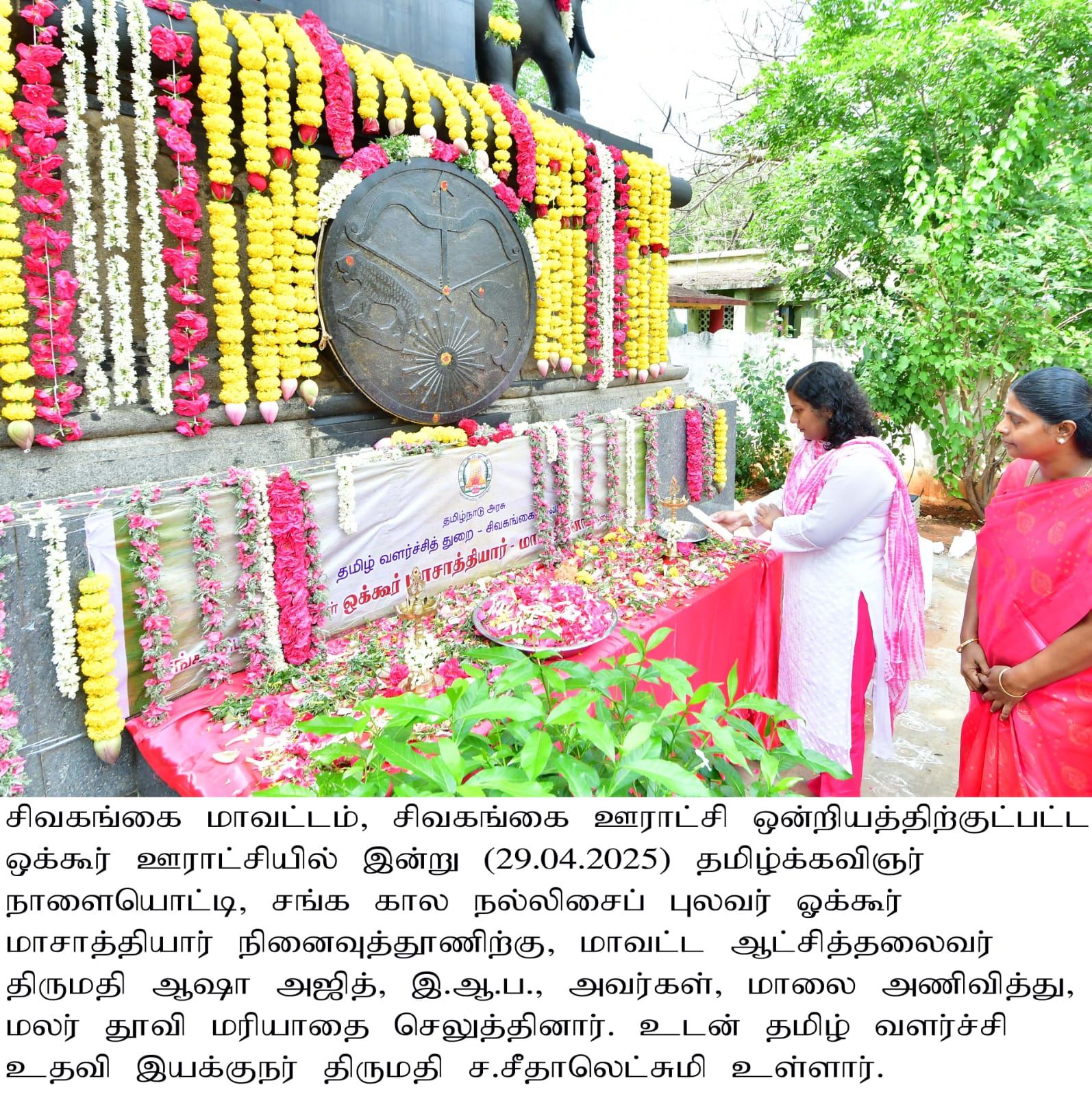 சிவகங்கை மாவட்டம், சிவகங்கை ஊராட்சி ஒன்றியத்திற்குட்பட்ட ஒக்கூர் ஊராட்சியில் , தமிழ்க்கவிஞர் நாளையொட்டி, சங்க கால நல்லிசைப் புலவர் ஓக்கூர் மாசாத்தியார் நினைவுத்தூணிற்கு, மாவட்ட ஆட்சித்தலைவர் ஆஷா அஜித், மாலை அணிவித்து, மலர் தூவி மரியாதை செலுத்தி தெரிவிக்கையில்,