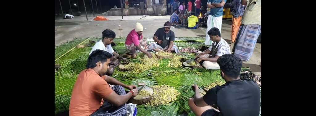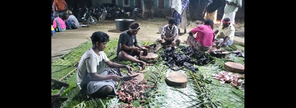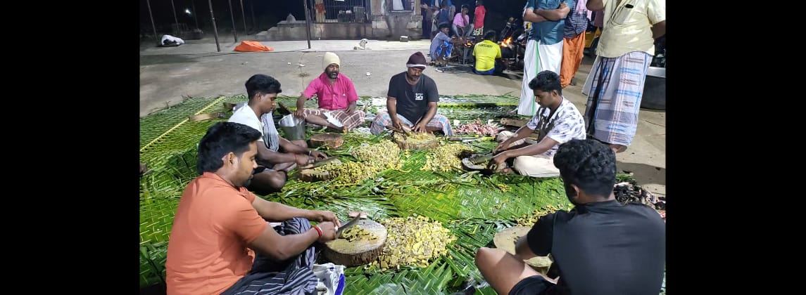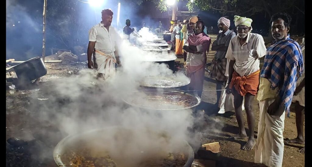 நத்தம் அருகே வேட்டைக்காரன் கோவில் திருவிழாவை முன்னிட்டு ஆண்கள் மட்டுமே பங்கேற்ற கறிவிருந்து விழா நடைபெற்றது.