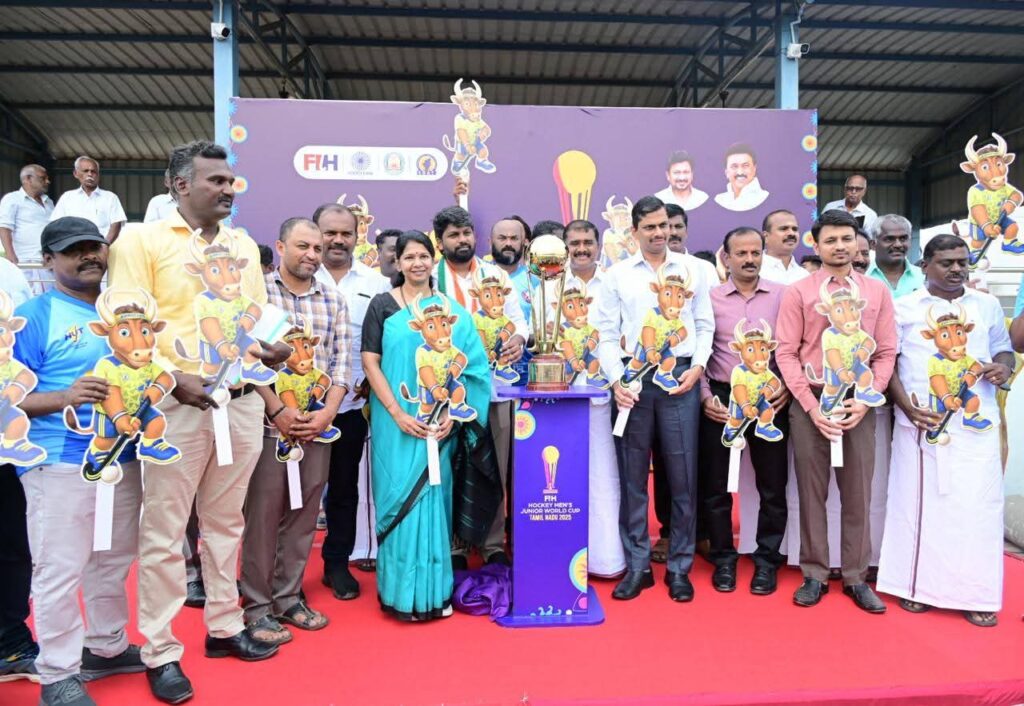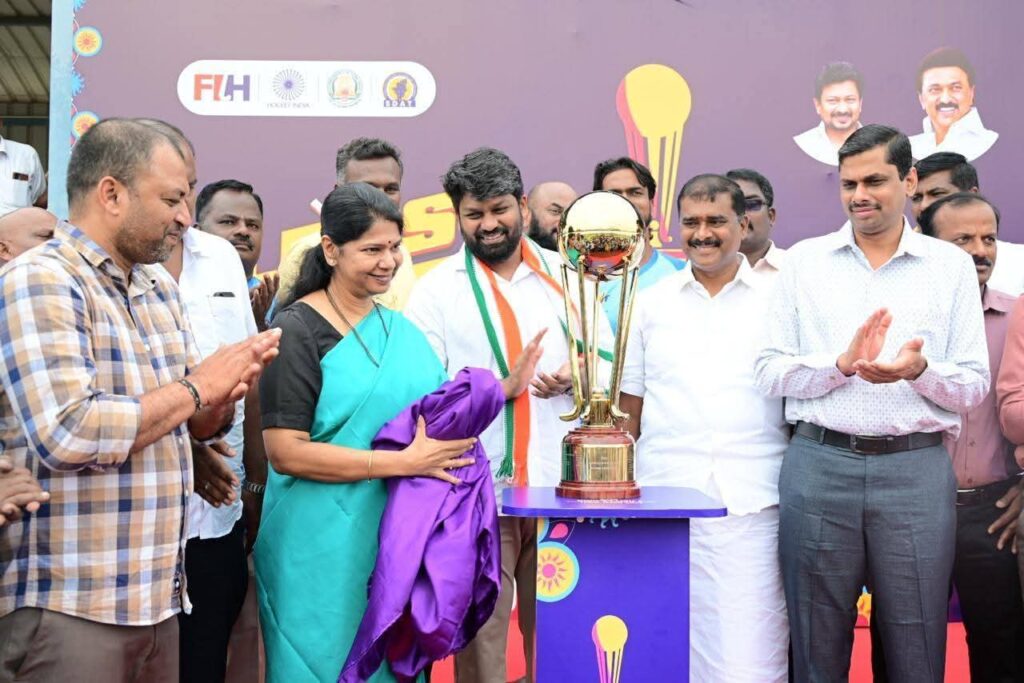 கோவில்பட்டி ஹாக்கி மைதானத்தில் 14-வது ஆடவர் ஹாக்கி இளையோர் உலகக் கோப்பை போட்டிக்கான வெற்றிக்கோப்பை கனிமொழி எம்பி அறிமுகப்படுத்தினார்.