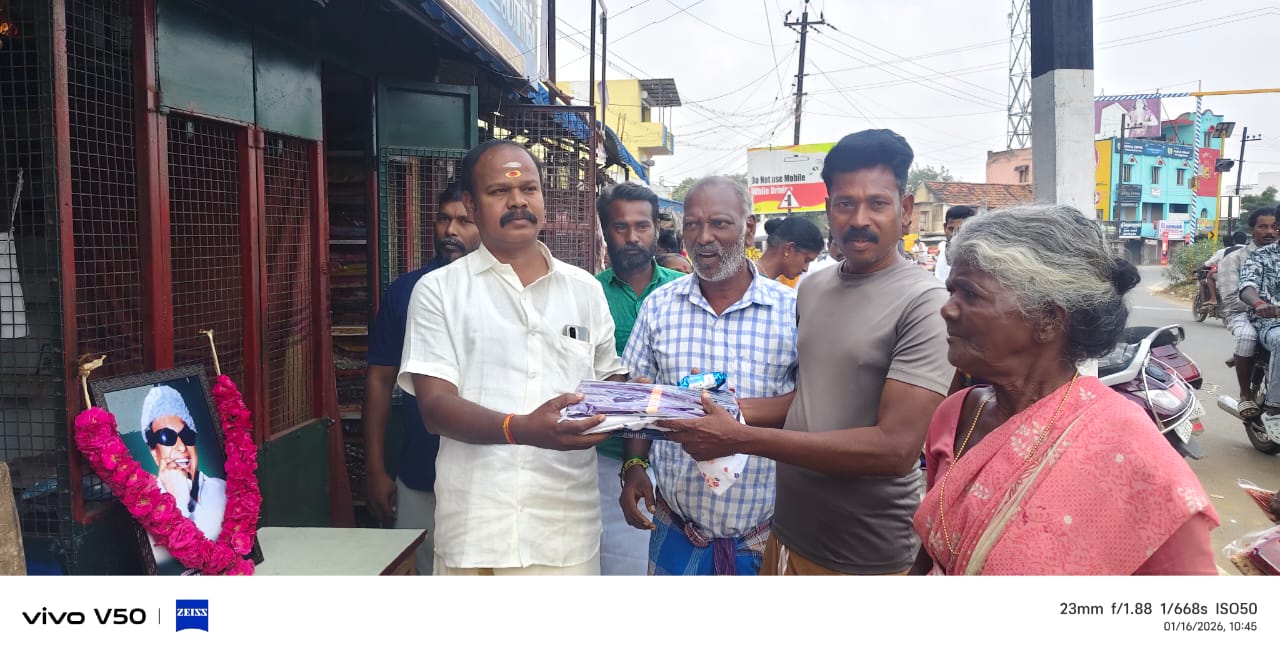 புதுக்கோட்டையில் முன்னாள் தமிழக முதல்வர் எம்.ஜி.ஆர் அவர்களின் 109-ஆவது பிறந்தநாள் விழாவை முன்னிட்டு மேட்டுப்பட்டி JKN.செல்லையா MGR சார்பில் புதுக்கோட்டை மாநகராட்சிக்கு உட்பட்ட பகுதியில் பணிபுரியும் துப்புறவுப் பணியாளர்கள், தூய்மைக் காவலர்கள் மற்றும் சிப்காட் காலனி மக்களுக்கும் வேட்டி,சேலைகள் மற்றும் இனிப்புகள் வழங்கப்பட்டது.
