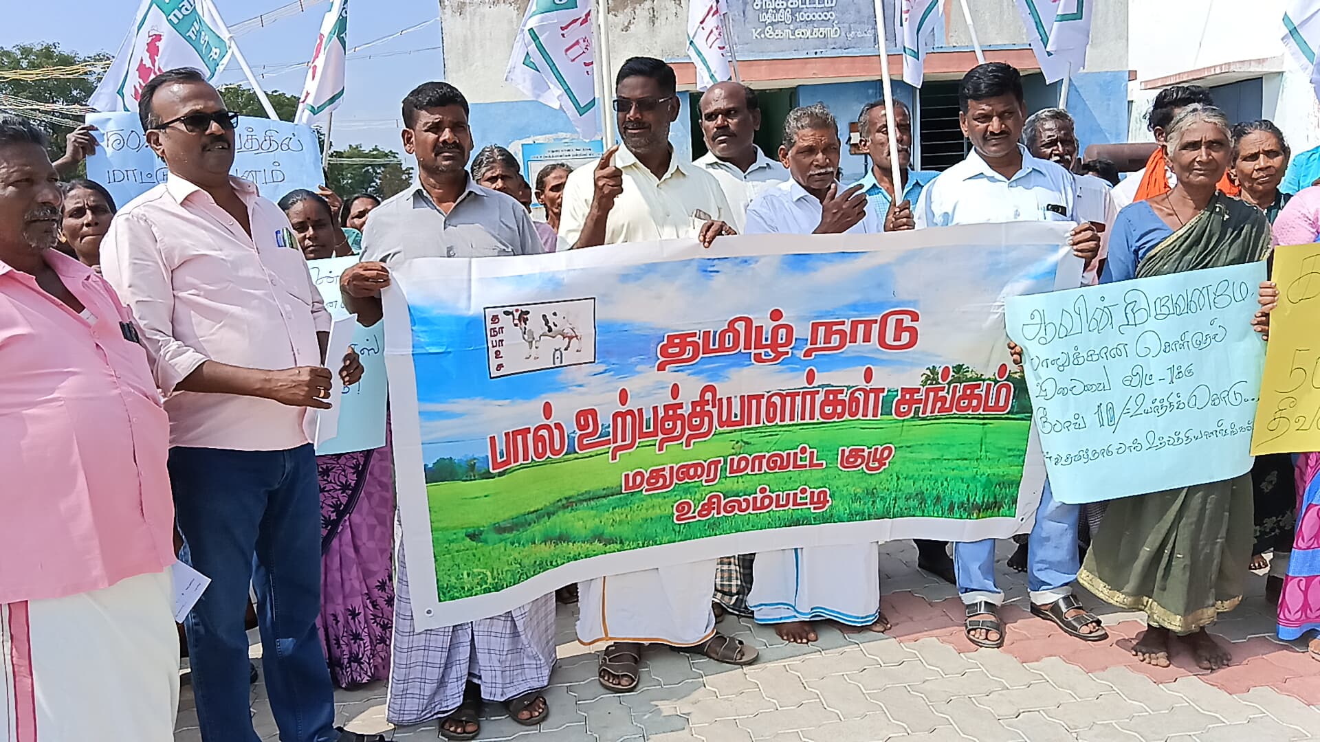 இதன் ஒரு பகுதியாக மதுரை மாவட்டம் உசிலம்பட்டி அருகே கருமாத்தூர் பால் உற்பத்தியாளர்கள் மையத்தில் பால் உற்பத்தி விலையை 10 ரூபாய் உயர்த்த கோரியும், கால்நடை தீவணத்திற்கு 50% மாணியம் வழங்க கோரியும், பொங்கல் போனஸ் பெற வழங்க வேண்டும் உள்ளிட்ட பல்வேறு அம்ச கோரிக்கைகளை வலியுறுத்தி கறவை மாடுகளுடன் கண்டன ஆர்ப்பாட்டம் நடத்தினர், தொடர்ந்து பொதுமக்களுக்கு இலவசமாக பால் வழங்கி நூதன போராட்டத்தில் ஈடுபட்டனர்.
