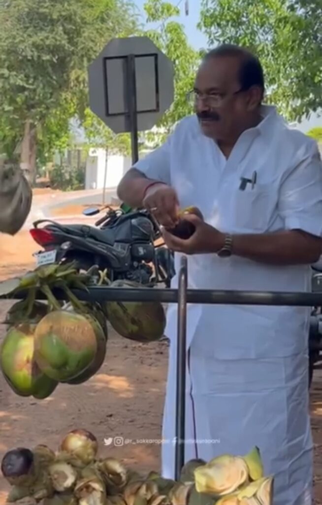 இந்நிலையில் மதிய நேரத்தில் கடுமையான வெயிலால் வெப்பக் காற்றால் தெருவில் நடமாட முடியாத நிலையில் அமைச்சர் அர.சக்கரபாணி கடுமையான வெயிலை பொருட்படுத்தாமல் மக்களை சந்தித்து வருகின்ற நிலையில் தனது காரில் வேடசந்தூர் – ஒட்டன்சத்திரம் மாநில நெடுஞ்சாலையில் செல்லும்போது காளாஞ்சிபட்டி அருகே சாலை ஓரத்தில் நுங்கு விற்பதை கண்டவுடன் அமைச்சர் அர.சக்கரபாணி தனது காரில் இருந்து இறங்கி நுங்கு விற்பனை செய்பவரிடம் பணம் கொடுத்து நுங்கு வாங்கி அதை அவரே எடுத்து ருசித்து சாப்பிட்டார்.