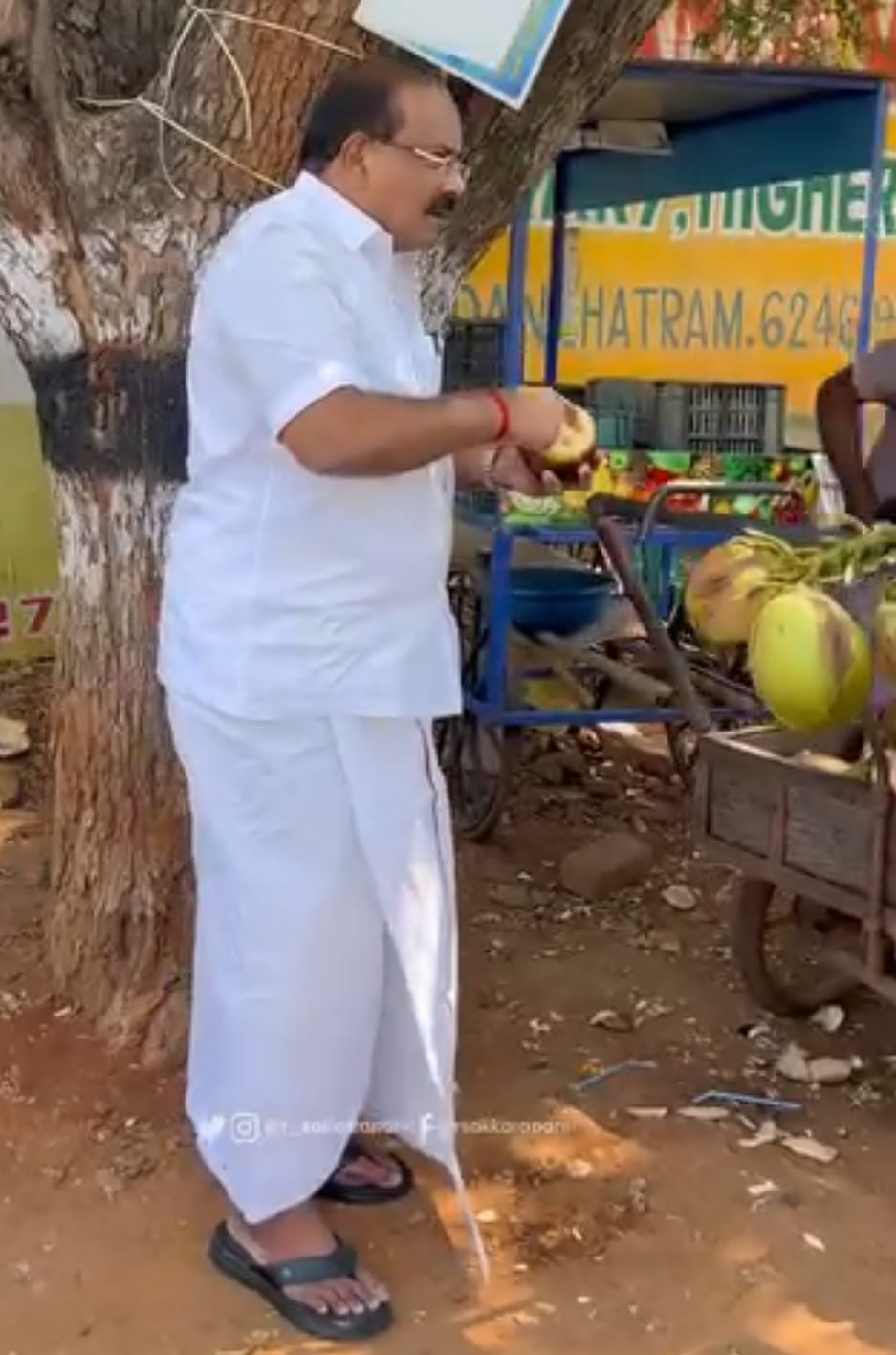 இந்நிலையில் மதிய நேரத்தில் கடுமையான வெயிலால் வெப்பக் காற்றால் தெருவில் நடமாட முடியாத நிலையில் அமைச்சர் அர.சக்கரபாணி கடுமையான வெயிலை பொருட்படுத்தாமல் மக்களை சந்தித்து வருகின்ற நிலையில் தனது காரில் வேடசந்தூர் – ஒட்டன்சத்திரம் மாநில நெடுஞ்சாலையில் செல்லும்போது காளாஞ்சிபட்டி அருகே சாலை ஓரத்தில் நுங்கு விற்பதை கண்டவுடன் அமைச்சர் அர.சக்கரபாணி தனது காரில் இருந்து இறங்கி நுங்கு விற்பனை செய்பவரிடம் பணம் கொடுத்து நுங்கு வாங்கி அதை அவரே எடுத்து ருசித்து சாப்பிட்டார்.
