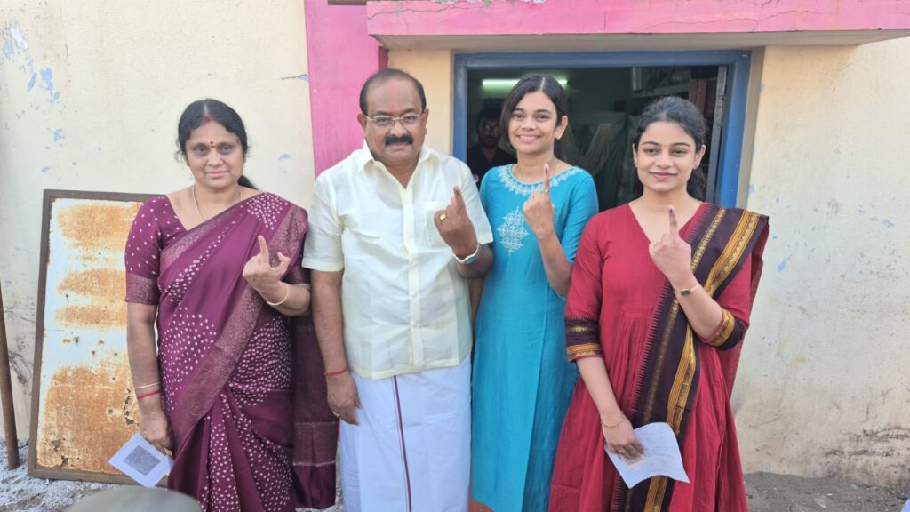 அமைச்சர் சக்கரபாணி தனது குடும்பத்துடன் வந்து கள்ளிமந்தயத்தில் ஓட்டளித்தார்.