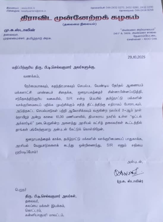 நேர்மையாகவும், சுதந்திரமாகவும் செயல்பட வேண்டிய தேர்தல் ஆணையம் மக்களாட்சி மாண்பைச் சிதைக்க, ஜனநாயகத்தைச் சின்னாபின்னப்படுத்தி, சந்தேகத்திற்குரிய வகையில், SIR என்ற பெயரில் தமிழ்நாட்டு மக்களின் வாக்குரிமையைப் பறிக்க முயற்சிக்கும் சதித் திட்டத்திற்கு எதிராகப் போராடவும். அடுத்தகட்ட செயல்பாடுகள் பற்றி ஆலோசிக்கவும் வருகின்ற நவம்பர் 2-ஆம் நாள் (ஞாயிறு) அன்று காலை 10.00 மணியளவில், தியாகராய நகரில் உள்ள “ஓட்டல் அக்கார்டில்” நடைபெறுகின்ற அனைத்து அரசியல் கட்சித் தலைவர்கள் கூட்டத்தில் தாங்கள் பங்கேற்குமாறு அன்புடன் கேட்டுக் கொள்கிறேன்.