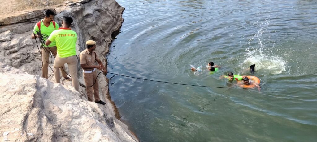 ஏழாயிரம் பண்ணை அருகே உள்ள இ. மேட்டூர் கிராமத்தில் கல்குவாரி பகுதியில் ஆற்றில் சிக்கிக் கொண்டவர்களை காப்பாற்றுவது குறித்தும் பின்னர் முதலுதவி அளிப்பது குறித்தும் தீயணைப்பு வீரர்கள் செயல் விளக்கம் அளித்தனர். இதனை திரளான பொதுமக்கள் பார்வையிட்டனர். மேலும் மழை பெய்து கண்மாய் மற்றும் ஊரணிகளில் தண்ணீர் நிரம்பினால் பாதுகாப்பு உபகரணங்கள் இல்லாமல் இறங்க முயற்சி செய்யக் கூடாது என பொதுமக்களுக்கு அறிவுறுத்தினர்.