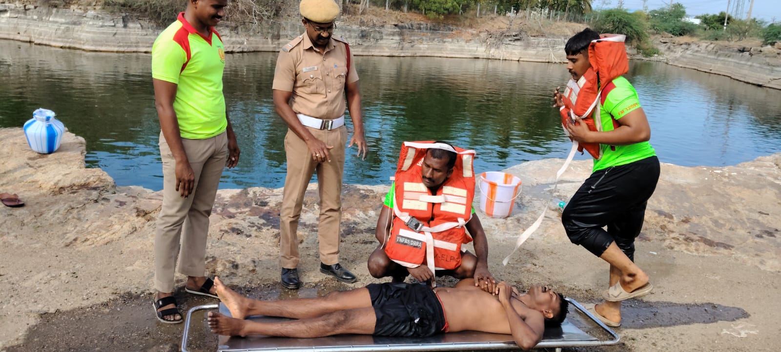 ஏழாயிரம் பண்ணை அருகே உள்ள இ. மேட்டூர் கிராமத்தில் கல்குவாரி பகுதியில் ஆற்றில் சிக்கிக் கொண்டவர்களை காப்பாற்றுவது குறித்தும் பின்னர் முதலுதவி அளிப்பது குறித்தும் தீயணைப்பு வீரர்கள் செயல் விளக்கம் அளித்தனர். இதனை திரளான பொதுமக்கள் பார்வையிட்டனர். மேலும் மழை பெய்து கண்மாய் மற்றும் ஊரணிகளில் தண்ணீர் நிரம்பினால் பாதுகாப்பு உபகரணங்கள் இல்லாமல் இறங்க முயற்சி செய்யக் கூடாது என பொதுமக்களுக்கு அறிவுறுத்தினர்.