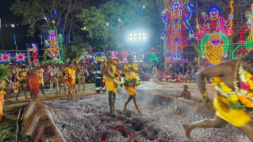 இதைத் தொடர்ந்து ஒவ்வொரு நாளும் அலங்கரிக்கப்பட்ட சப்பரத்தில் அம்மன் வீதி உலா நடைபெற்றது கோவில் நிர்வாகம் சார்பில் கலை நிகழ்ச்சிகளும் நடைபெற்றன. நேத்து தொடர்ந்து பத்தாம் நாள் திருவிழா இன்று 200க்கும் மேற்பட்ட பக்தர்கள் பூக்குழி இறங்கி தங்களுடைய நேர்த்திக்கடனை நிறைவேற்றினர்.
