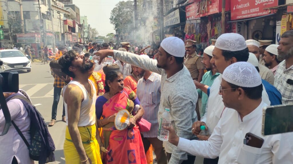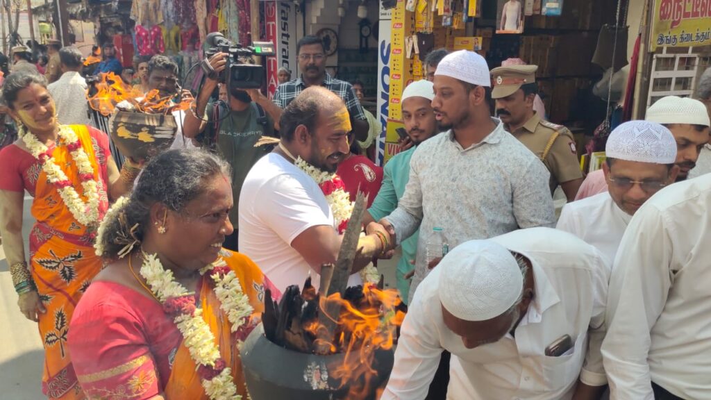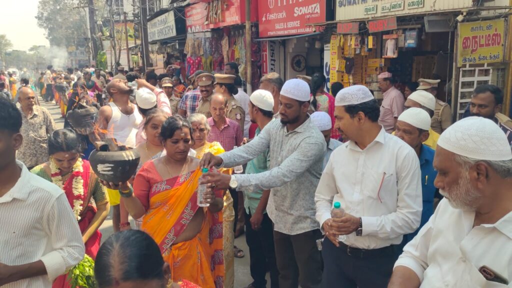 கோவை கோனியம்மன் கோயில் திருவிழாவின் போது தீச்சட்டி எடுத்து ஊர்வலமாக வந்தவர்களுக்கு இஸ்லாமியர்கள் தண்ணீர் கொடுத்து உபசரித்து மத நல்லிணக்கம் பாராட்டியது நெகிழ்ச்சியை ஏற்படுத்தியுள்ளது.