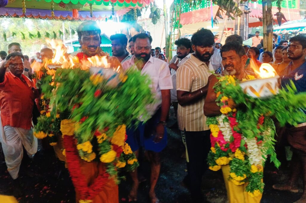 இக்கோவிலில் கடந்த 2005 ஆம் ஆண்டு திருவிழா நடந்தது.21 ஆண்டுகளுக்குப் பிறகு இந்த ஆண்டு கடந்த வாரம் திருவிழா கொடியேற்று விழா நடைபெற்றது. இதிலிருந்து பக்தர்கள் காப்பு கட்டி விரதம் இருந்து வந்தனர். நேற்றைய முன் தினம் மாலை அம்மன் சிலையை எடுத்து ஊர்வலமாக கோவிலுக்கு வந்து சேர்ந்தனர். முளைப்பாரி எடுத்து ஊர்வலமாக கோவிலுக்கு முன்பு வைத்து கும்மி அடித்து பாடி ஆடினர். அன்றிரவு மாவிளக்கு எடுத்து அம்மனை வேண்டி தரிசனம் செய்தனர். இரவு வள்ளி திருமண நாடகம் நடந்தது. நேற்று மதியம் கிராம மக்கள் பொங்கல் வைத்து வழிபட்டனர். மாலை அக்கினி சட்டி எடுத்து வந்து தங்களது நேர்த்திக்கடனை செலுத்தினர்.