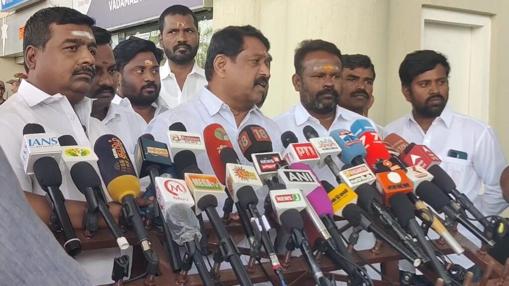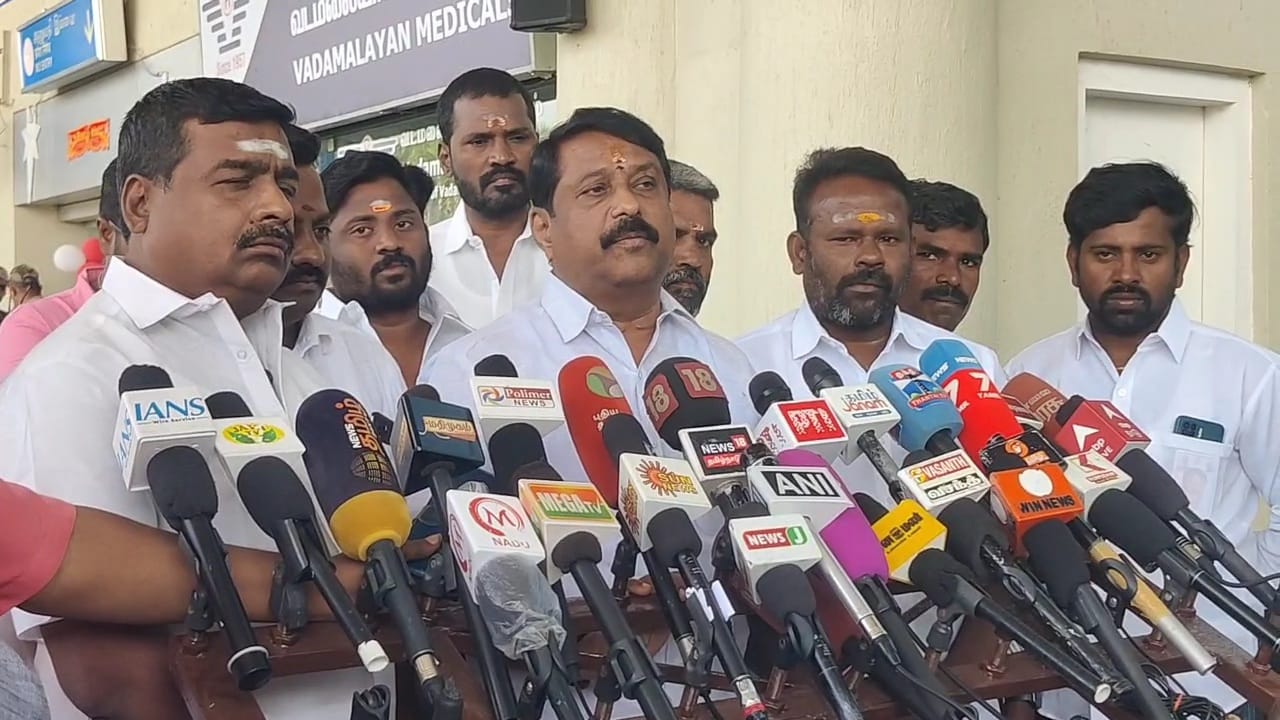 அது திமுகவினரால் பரப்பி விடப்பட்ட செயல். வாக்கு வங்கிக்காக முதல்வர் பின்னணியில் இப்படி நடைபெறுகிறது என கூறினார். மதுரை விமான நிலையத்தில் செய்தியாளர்களை சந்தித்து வருகிறார். அதன். நேரடி காட்சிகளை காணலாம்.* தமிழிசை சௌந்தரராஜன் சொன்னது நல்ல கருத்து. பாதுகாப்பு என்று அவர் குறிப்பிட்டு இருப்பது ஒருவேளை நாளை வேற மாதிரி சூழல் வந்தால் விஜய்க்கு பாதுகாப்பு இருக்காது. கரூரிலும் அவருக்கு பாதுகாப்பு கொடுக்கப்படவில்லை. -நயினார் நாகேந்திரன் பேட்டி