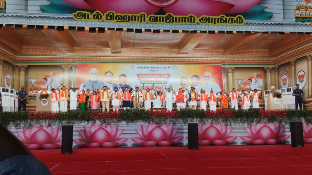இந்நிகழ்வில் சிறப்பு அழைப்பாளராக வந்து கலந்து கொண்ட மத்திய உள்துறை அமைச்சர் மாண்புமிகு அமைச்சர் அமித் ஷா மேடைக்கு வந்து மைக் பிடித்த உடன் தொண்டர்களின் கோஷம் அதிர்ந்தது. மேலும் தொண்டர்கள் தங்கள் கையில் வைத்திருந்த காவித்துண்டை தலைக்கு மேல் சுற்றி தங்களது மகிழ்ச்சி ஆரவாரத்தை தெரிவித்தனர். அதைப் பார்த்த அமித்ஷா இன்னும் சத்தமாக இன்னும் சத்தமாக என்று சொல்லிக் கொண்டிருந்தார். பின்னர் என்டிய கூட்டணி அமைக்க வேண்டுமா வேண்டாமா என்று கேள்வி கேட்டார். வேண்டும் வேண்டும் என்று தொண்டர்கள் முழக்கமிட்டனர். தொடர்ந்து பேசிய அமித்ஷா பாரதப் பிரதமர் மோடி தலைமையில் தமிழ்நாட்டில் பாரதிய ஜனதா கட்சி ஆட்சி அமைய வேண்டும். அதற்காக உங்களது உறுதிப்பாட்டை வெளிப்படுத்துங்கள். கைகளை உயர்த்துங்கள். உரத்த குரலில் முழக்கம் செய்யுங்கள்.
