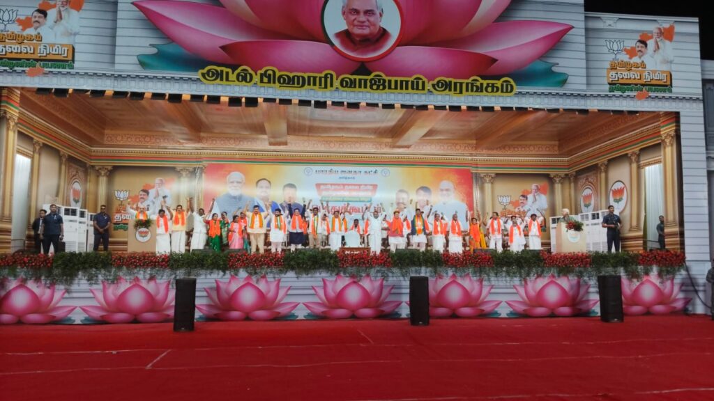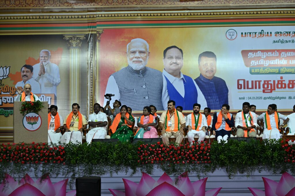நமக்கு மிகவும் பிரியமான மோடி அவர்கள் 2024 ஆம் ஆண்டு மூன்றாவது முறையாக பிரதமராக பொறுப்பேற்றுக் கொண்டார். அதைத்தொடர்ந்து ஒரிசாவில் முதன்முதலாக நமது பாஜக அரசு ஆட்சி அமைத்தது. அதனைத் தொடர்ந்து ஆந்திராவில் ஆட்சியமைத்தது. 2025 ஆம் ஆண்டு ஹரியானாவிலும் மகாராஷ்டிராவிலும் மூன்றாவது முறையாக ஆட்சி அமைத்தது. அதே ஆண்டில் தான் 27 ஆண்டுகளுக்குப் பிறகு டெல்லியில் மீண்டும் பாஜக ஆட்சி அமைத்தது. அதே ஆண்டில் பீகாரில் இந்தியக் கூட்டணி மண்ணைக் கவ்வியது. இப்போது 2026. இது தமிழ்நாட்டின் முறை. இந்த ஆண்டு தமிழ்நாட்டிலும் வங்காளத்திலும் வெற்றியை கொண்டாட இருக்கிறோம். இங்கே குழுமியிருக்கும் காரிய கர்த்தாக்கள் ஒரு உறுதியான நிலைப்பாட்டோடு இங்கிருந்து பயணிக்க வேண்டும். மேற்கு வங்காளத்திலும் தமிழ்நாட்டிலும் இன்று பெரும்பான்மையை பெறவேண்டும். இங்கு நீங்கள் ஒலிக்கும் குரல் சார்ஜ் கோட்டையை எட்ட வேண்டும் என்று பேசினார்.