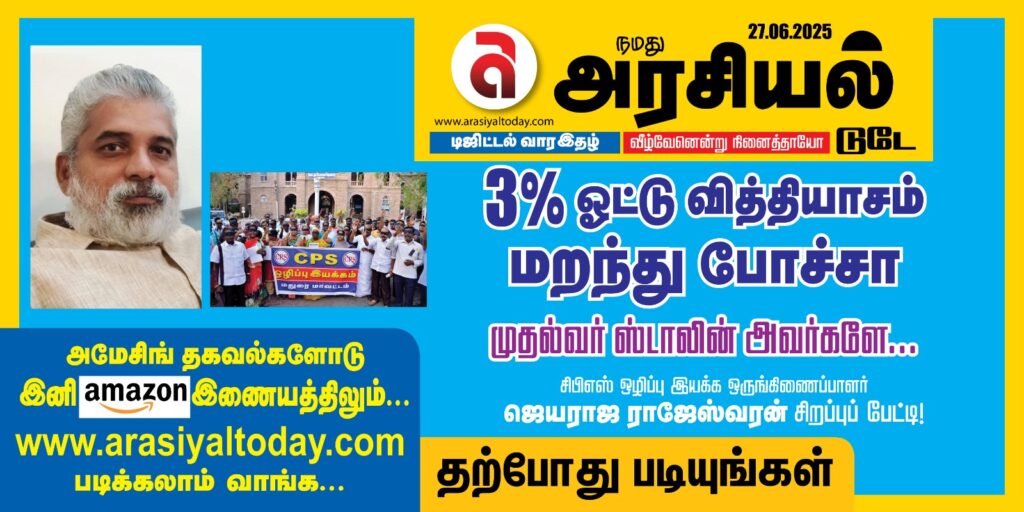 👆 மேலே உள்ள லிங்கை டச் செய்து ₹ 5 ரூபாய் கட்டணத்தை செலுத்தி நமது அரசியல் டுடே மின் இதழை படித்து மகிழுங்கள் …. 3 % ஓட்டு வித்தியாசம் மறந்து போச்சா முதல்வர் ஸ்டாலின் அவர்களே … சிபிஎஸ் ஒழிப்பு இயக்கம் ஒருங்கிணைப்பாளர் ஜெய ராஜராஜேஸ்வரன் சிறப்பு பேட்டி!