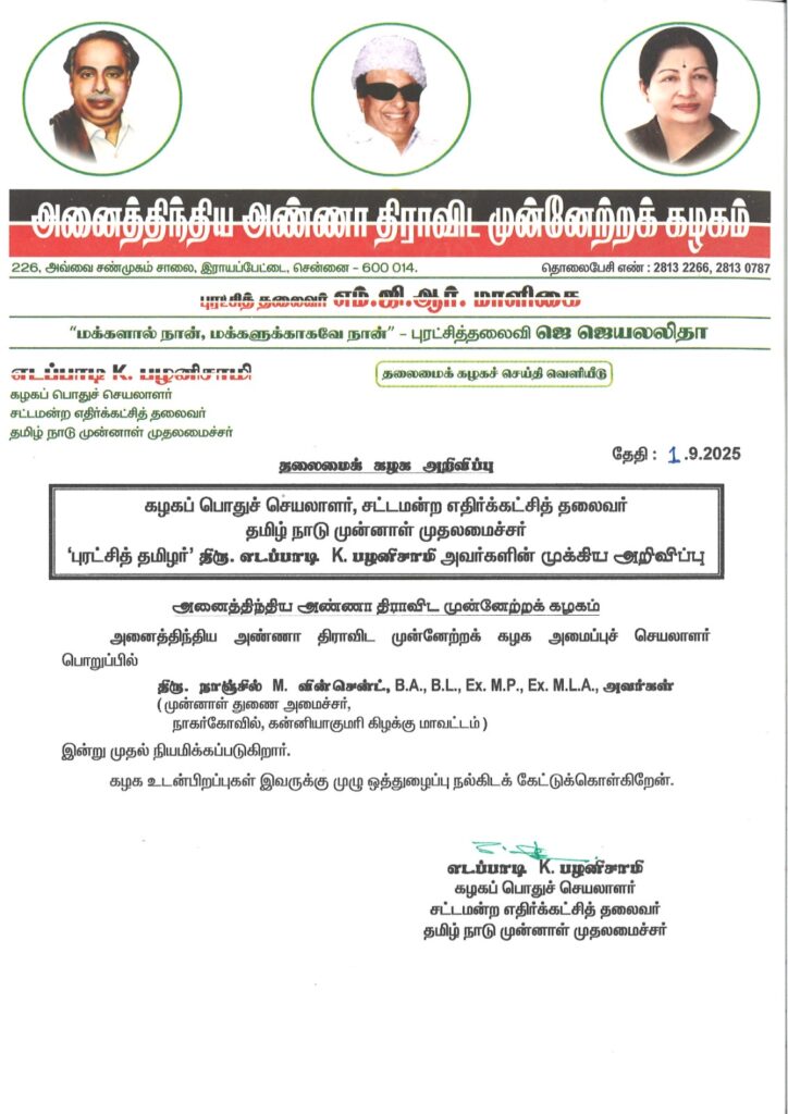 அதிமுக பொதுச் செயலாளர் எடப்பாடி பழனிச்சாமி இன்று (செப்டம்பர்_1)ம் நாள் ஒரு அறிக்கையின் மூலம். கழக அமைப்பு செயலாளராக நாஞ்சில் வின்சென்ட் அறிவித்துள்ளார்.