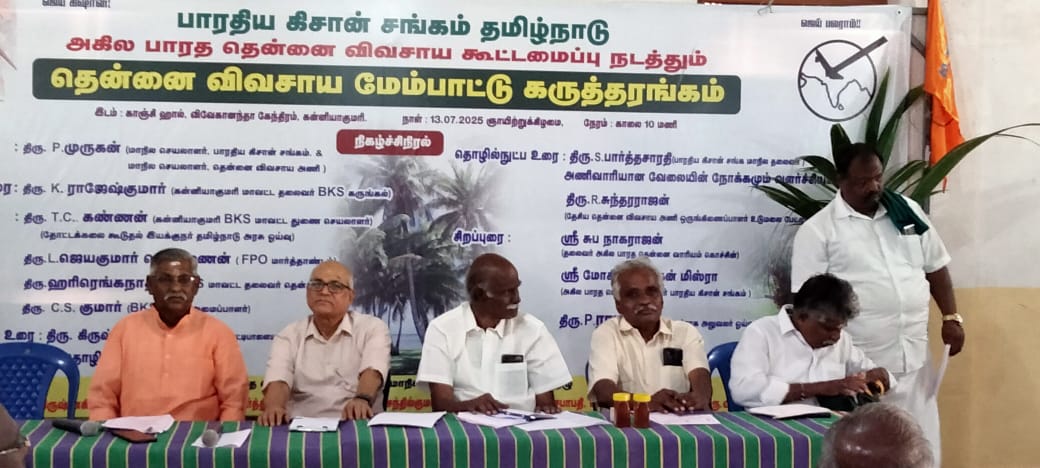 கருத்தரங்கிற்கு பாரதிய கிசான் சங்கத்தின் மாநில செயலர் முருகன் தலைமையில் நடைபெற்ற நிகழ்வில். குமரி மாவட்ட தலைவர் ராஜேஷ்குமார், மாவட்ட துணை செயலாளர் கண்ணன், கருத்தரங்கில் அகில இந்திய தென்னை வாரியம் தலைவர் சுபநாகராஜன், பொதுச்செயலாளர் மோகினி மோகன் மிஸ்ரா, மாநில பாரதிய கிசான் சங்கத்தின் தலைவர் பார்த்த சாரதி மற்றும் மாநில நிர்வாகிகள் பங்கேற்ற நிகழ்வில் தெரிவிக்கப்பட்ட கருத்துக்கள் மற்றும் தீர்மானங்கள்.