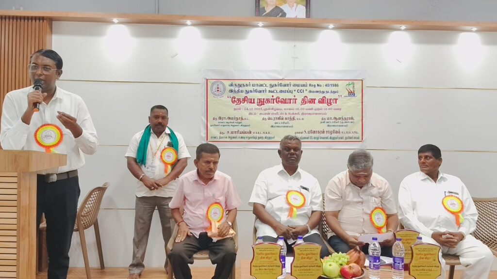விருதுநகர் மாவட்டம் இராஜபாளையம் முடங்கியாறு சாலையில் உள்ள தனியார் கூட்டரங்கில் நடைபெற்ற விழாவிற்கு நுகர்வோர் மாவட்ட பொதுச்செயலாளர் மனோகரன் சாமுவேல் தலைமை வகித்தார்.