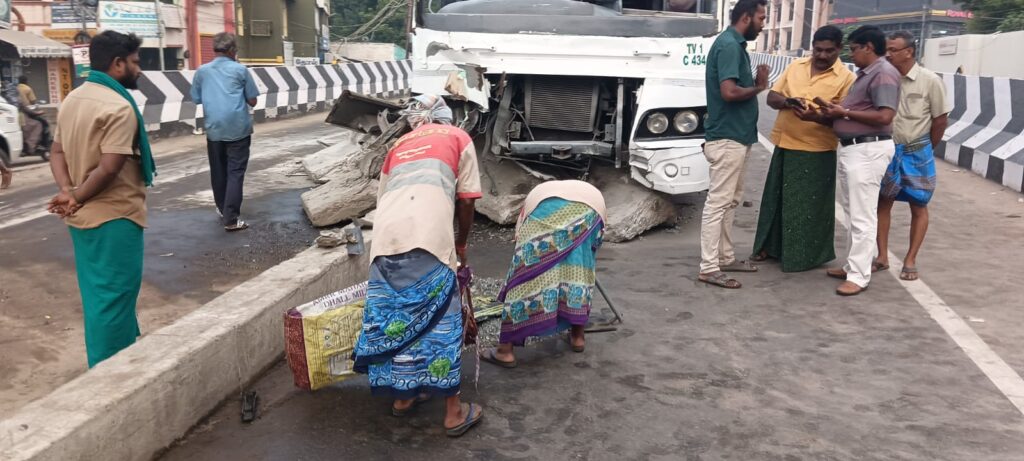 அப்பொழுது இரண்டு ஓட்டுனர்கள் இருந்த நிலையில் ஓசூரில் இருந்து சேலம் வரை ஒரு ஓட்டுனரும் சேலத்தில் இருந்து தென்காசி மாவட்டத்தை சேர்ந்த ராஜ செல்வம் மதுரை வரை ஒரு ஓட்டுநரும் ஓட்டி வந்துள்ளனர். மதுரை நகருக்குள் தூக்க கலக்கத்தில் இருந்ததாக தெரிய வருகிறது. வரும்பொழுது முடக்கு சாலை பாலத்தில் ஏறும் பொழுது எதிர்பாராத விதமாக பாலத்தின் சென்டர் மீடியரில் வாகனம் மோதி நின்றது. நல்வாய்ப்பாக யாருக்கும் எவ்வித காயமும் ஏற்படவில்லை. சம்பவ குறித்து தகவல் அறிந்த திடீர் நகர் போக்குவரத்து புலனாக போலீசார் அரசு விரைவு போக்குவரத்து கழக தேசிய நெடுஞ்சாலைத்துறை மற்றும் போக்குவரத்து போலீசார் இணைந்து விபத்தில் சிக்கிய பேருந்தை அகற்றும் வேலையில் ஈடுபட்டனர். துரிதமாக செயல்பட்டு சாலையில் சிந்தியிருந்த கண்ணாடி துகள்கள் மற்றும் ஆயில்கள் ஆகியவை மணல் கொண்டு மூடி அகற்றினர். இதனால் மேலும் விபத்துக்கள் நடப்பது தவிர்க்கப்பட்டது. தொடர்ந்து இதுபோன்ற விபத்துக்கள் அப்பாலத்தில் நடப்பதால் சம்பந்தப்பட்ட துறை அதிகாரிகள் பாலத்தில் இனி விபத்துக்கள் நடக்காமல் இருப்பதற்கு ஆய்வு மேற்கொண்டு விபத்துக்கள் நடக்காமல் இருப்பதற்கு செய்து உரிய நடவடிக்கை எடுக்க வேண்டும் என்பதை அனைவரும் கோரிக்கையாக உள்ளது. மேலும் விபத்துக்கள் நடக்காமல் இருப்பதற்கு தேசிய நெடுஞ்சாலை துறை உரிய நடவடிக்கை எடுக்குமா.