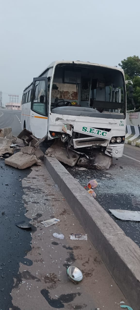 அப்பொழுது இரண்டு ஓட்டுனர்கள் இருந்த நிலையில் ஓசூரில் இருந்து சேலம் வரை ஒரு ஓட்டுனரும் சேலத்தில் இருந்து தென்காசி மாவட்டத்தை சேர்ந்த ராஜ செல்வம் மதுரை வரை ஒரு ஓட்டுநரும் ஓட்டி வந்துள்ளனர். மதுரை நகருக்குள் தூக்க கலக்கத்தில் இருந்ததாக தெரிய வருகிறது. வரும்பொழுது முடக்கு சாலை பாலத்தில் ஏறும் பொழுது எதிர்பாராத விதமாக பாலத்தின் சென்டர் மீடியரில் வாகனம் மோதி நின்றது. நல்வாய்ப்பாக யாருக்கும் எவ்வித காயமும் ஏற்படவில்லை. சம்பவ குறித்து தகவல் அறிந்த திடீர் நகர் போக்குவரத்து புலனாக போலீசார் அரசு விரைவு போக்குவரத்து கழக தேசிய நெடுஞ்சாலைத்துறை மற்றும் போக்குவரத்து போலீசார் இணைந்து விபத்தில் சிக்கிய பேருந்தை அகற்றும் வேலையில் ஈடுபட்டனர். துரிதமாக செயல்பட்டு சாலையில் சிந்தியிருந்த கண்ணாடி துகள்கள் மற்றும் ஆயில்கள் ஆகியவை மணல் கொண்டு மூடி அகற்றினர். இதனால் மேலும் விபத்துக்கள் நடப்பது தவிர்க்கப்பட்டது. தொடர்ந்து இதுபோன்ற விபத்துக்கள் அப்பாலத்தில் நடப்பதால் சம்பந்தப்பட்ட துறை அதிகாரிகள் பாலத்தில் இனி விபத்துக்கள் நடக்காமல் இருப்பதற்கு ஆய்வு மேற்கொண்டு விபத்துக்கள் நடக்காமல் இருப்பதற்கு செய்து உரிய நடவடிக்கை எடுக்க வேண்டும் என்பதை அனைவரும் கோரிக்கையாக உள்ளது. மேலும் விபத்துக்கள் நடக்காமல் இருப்பதற்கு தேசிய நெடுஞ்சாலை துறை உரிய நடவடிக்கை எடுக்குமா.