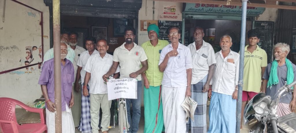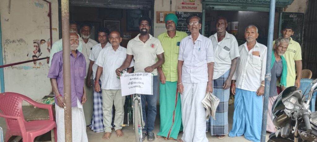 அரியலூர் மாவட்டம் உடையார்பாளையம் அருகே உள்ள பரணம் கிராமத்தைச்சேர்ந்த இயற்கை ஆர்வலர் பழனிச்சாமி பிரபஞ்சத்தை காக்கும் பயணத்தை அரியலூர் மாவட்டம் கொள்ளிடக்கரையோரம் உள்ள திருமானூரிலிருந்து சனிக்கிழமை மிதிவண்டி பயணத்தை துவங்கி இராமநாதபுரம் மாவட்டம் தனுஷ்கோடி வரை மூன்று நாள் பயணமாக செல்கிறார்.