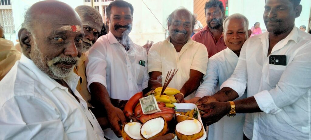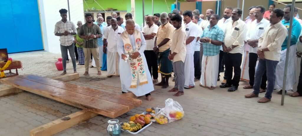 அலங்கார உபகார மாதா திருத்தல கோவில் தேர் பெறைக்கு முன்னால் உள்ள வளாகத்தில். புதிய தேர் பணிக்கான ‘தச்சு’ பணியை, தேவாலய பங்கு தந்தை உபால்ட் ஜெபித்து தேர் செய்வதற்கான பணியை தொடங்கி வைத்தார்.