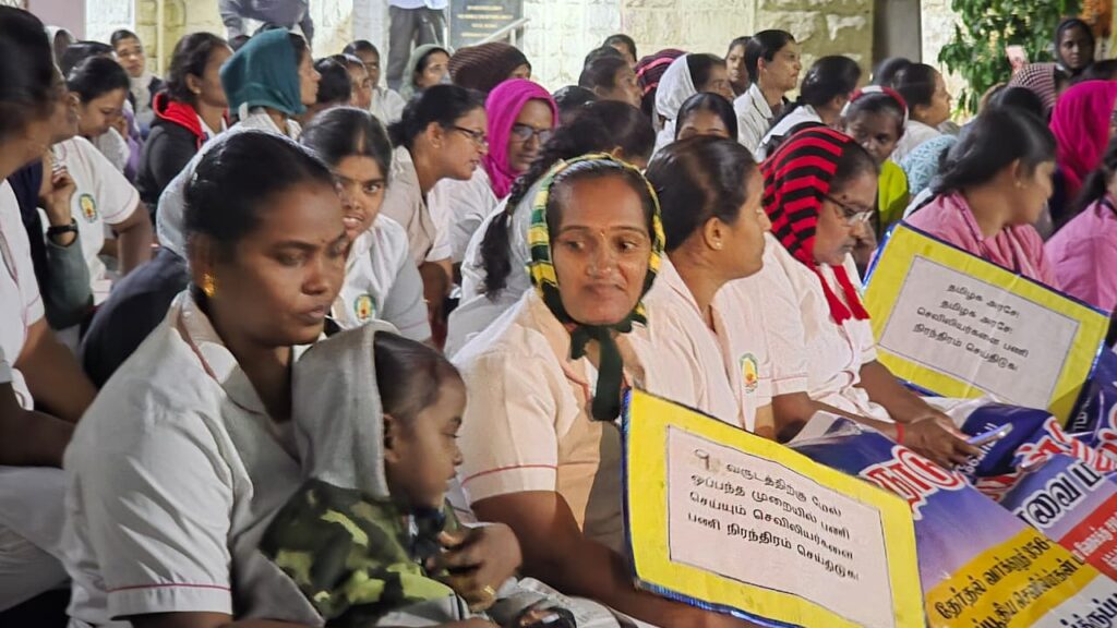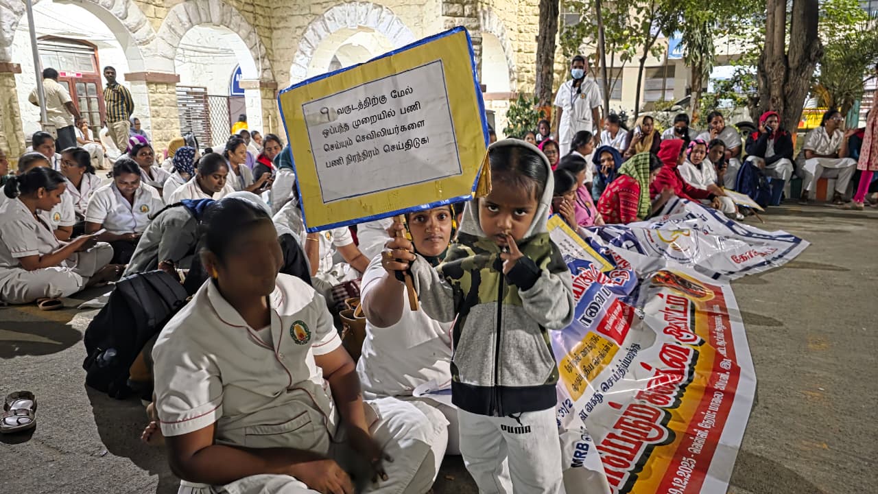 மேலும், தேர்தல் காலத்தில் தி.மு.க அரசு ஆட்சி அமைந்ததும் அனைத்து செவிலியர்களையும் பணி நிரந்தரம் செய்வோம் என வாக்குறுதி அளிக்கப்பட்டதாகவும், ஆனால் ஆட்சி அமைந்து நீண்ட காலம் ஆகியும் செவிலியர்களின் கோரிக்கைகள் நிறைவேற்றப்படவில்லை என்றும் அவர்கள் குற்றம்சாட்டினர்.