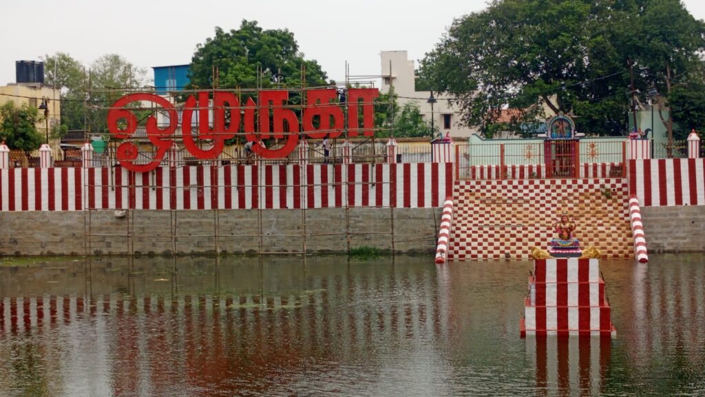 திருப்பரங்குன்றம் கோவில் லெட்சுமி தீர்த்தகுளத்தில் ரூ 20 லட்சத்தில் ஓம்முருகா எழுத்து வடிவம் மற்றும் 36 அடி உயரம் கொண்ட நியான் விளக்குகள் பொருத்தும் பணி தொடங்கி நடந்து வருகிறது.